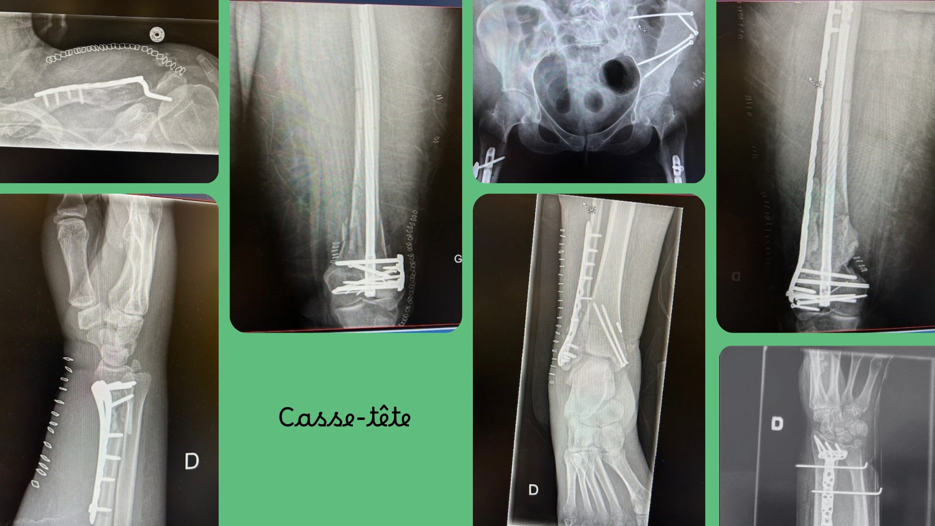 Bon. J’ai fait exprès de vous flasher mes radiographies. Tout ça, c’est à moi. Je suis propriétaire de l0 livres de métal dans mon corps. Je me doute que je ne passerai pas inaperçue la prochaine fois que je passerai le contrôle-sécurité d’un aéroport. Oups!